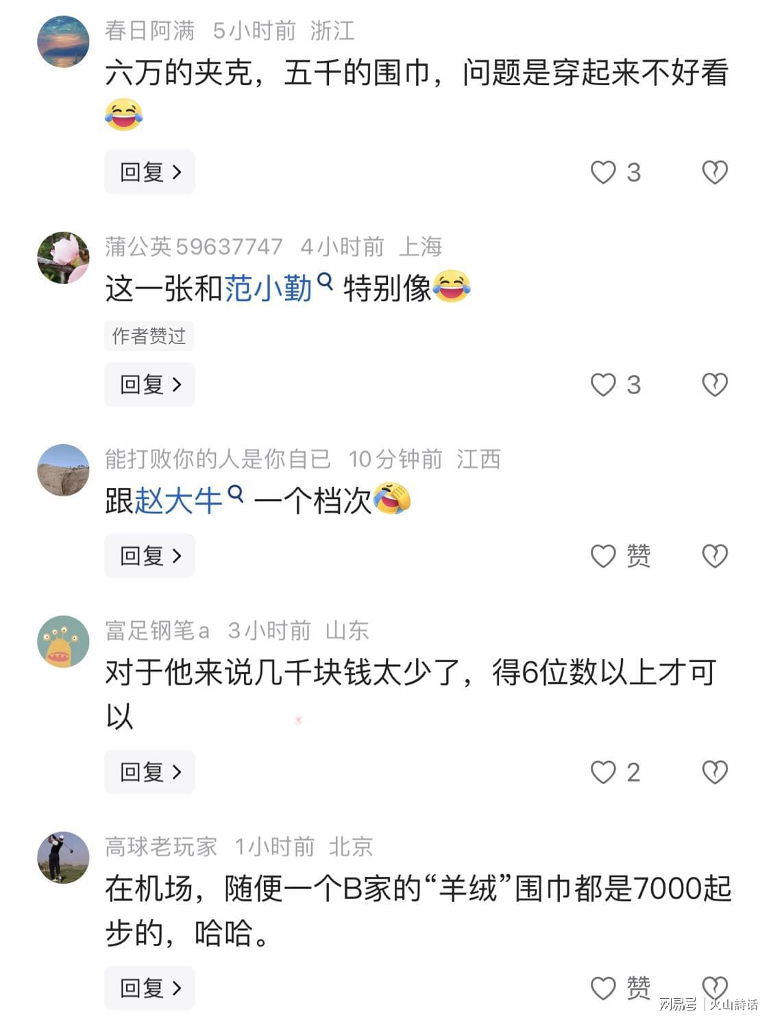 有网友评论,六万的夹克,五千的围巾,问题是穿起来不好看。